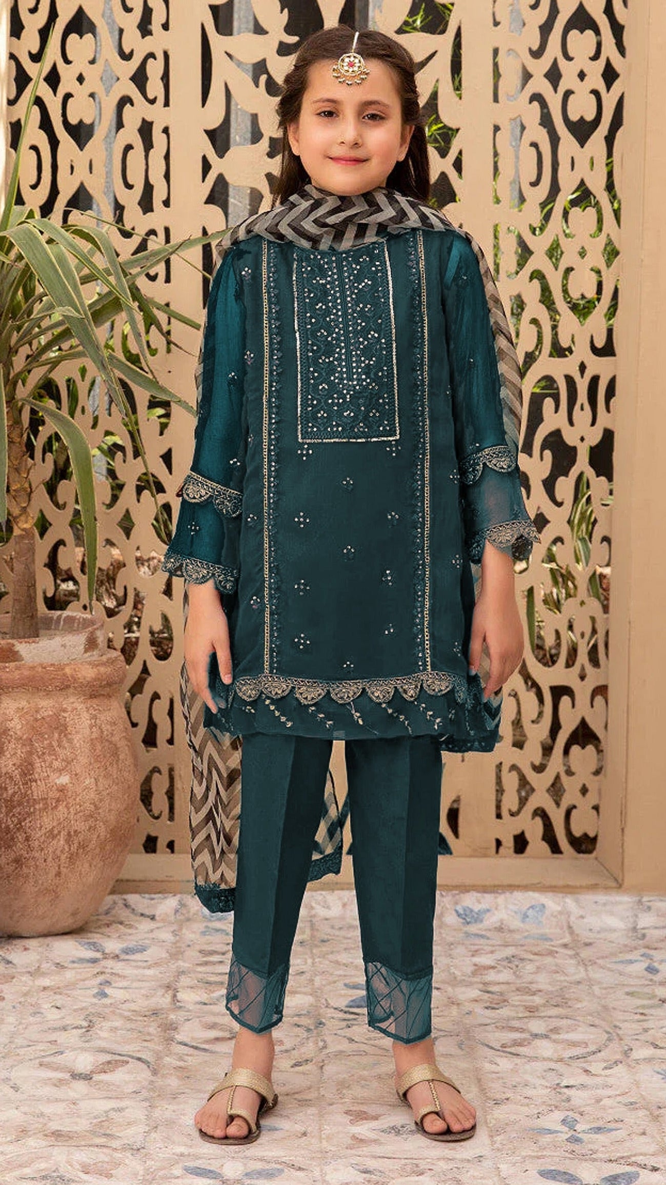 Create the most adorable eastern look for your little princess with this beautifully embroidered two-piece set. The ensemble features an elegant embroidered shirt paired with coordinating embroidered culottes for a charming and graceful finish.