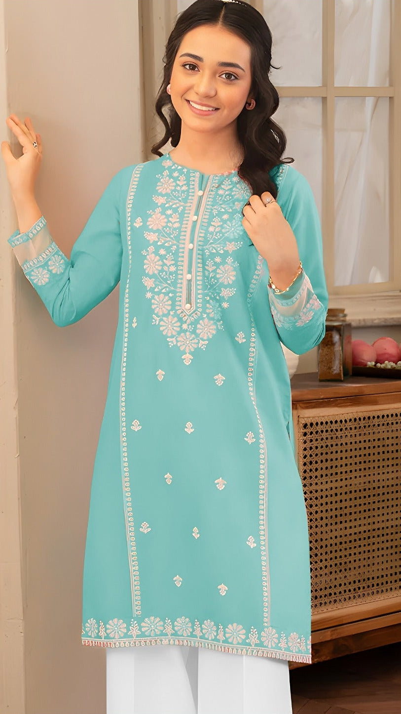 Create the most adorable eastern look for your little princess with this beautifully embroidered two-piece set. The ensemble features an elegant embroidered shirt paired with coordinating embroidered culottes for a charming and graceful finish.